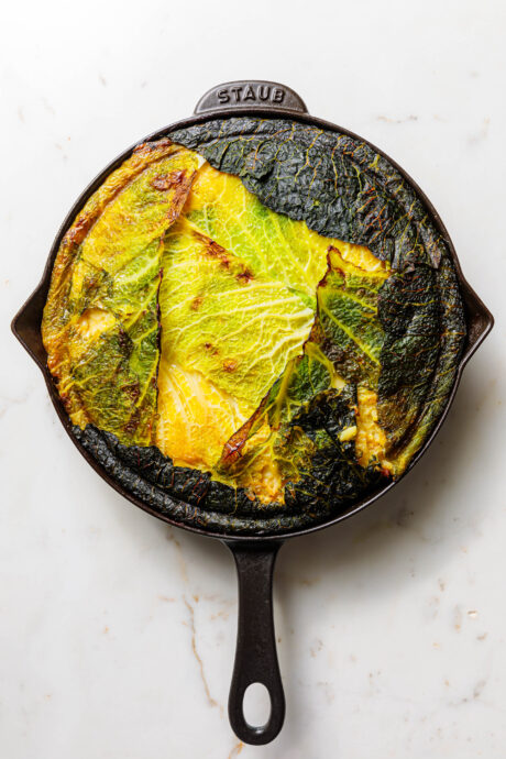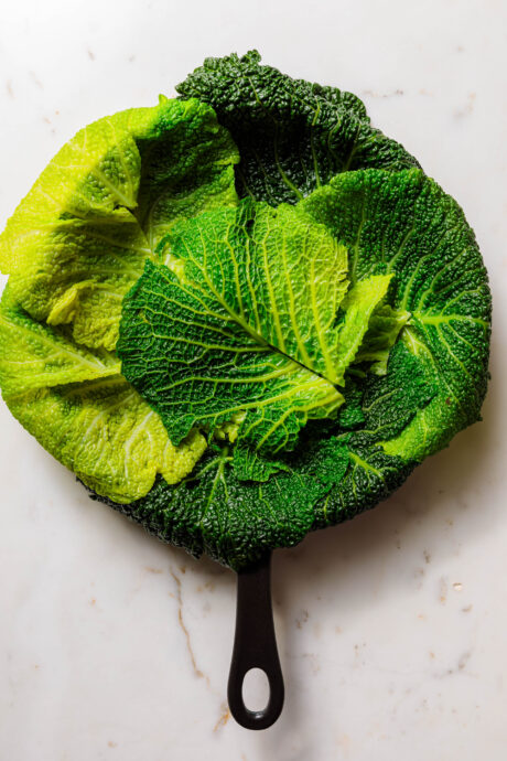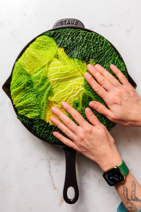 Jetzt kommt der schönste Teil: das Zusammenbauen unseres Wirsing-Pies! Unsere ofenfeste Pfanne spülen dafür nur kurz mit warmem Wasser aus und trocknen sie gut ab. Solltet ihr keine feuerfeste Pfanne haben, könnt ihr auch eine runde Auflaufform benutzen. Die Pfanne pinseln wir mit etwas flüssiger veganer Butter oder Öl aus. Dann legen wir die Wirsingblätter mit der groben, schönen Blattinnenseite nach außen zeigend in die Pfanne. Die Blätter sollen etwa fünf Zentimeter über den Rand überstehen, sodass wir sie später nach innen umklappen können, um den Pie zu verschließen.