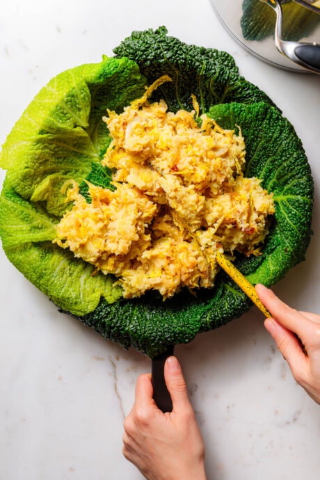 Das heißt aber nicht, dass es auf dem Teller weniger opulent zugeht. Leicht knusprige Wirsingblätter ummanteln geschichtete, würzige Kartoffel- und herzhaft-rauchige Pilz-Linsenfüllungen. Die Kartoffelfüllung geht dabei schon in Richtung Knödelkonsistenz – so haben wir quasi Beilage und Hauptgang in einem!