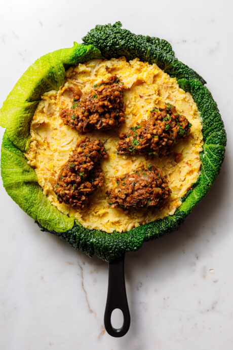 Mit diesem superschicken Wirsing-Pie mit würzigen Pilzen und Linsen und herzhafter Kartoffelknödelfüllung machen wir dieses Jahr Gemüse zum absoluten Star unseres veganen Weihnachtsmenüs.