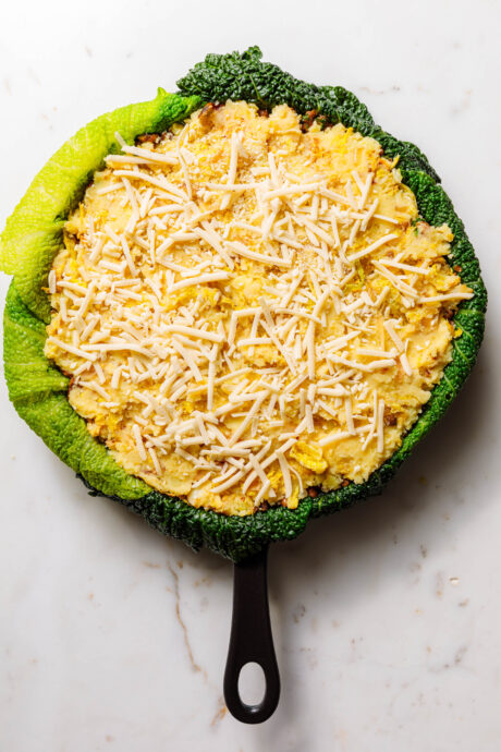 - Die Hälfte der Kartoffelfüllung hineingeben und glatt verstreichen. Dann die Pilz-Linsenfüllung darauf verteilen und mit der restlichen Kartoffelfüllung abschließen. Dabei jeweils darauf achten, dass die Füllungen gut angedrückt werden. Optional mit veganem Käse bestreuen. Dann die restlichen Wirsingblätter auf der Kartoffelschicht verteilen. Überstehende Blätter nach innen einfalten und alles gut festdrücken.40 g veganer Reibekäse