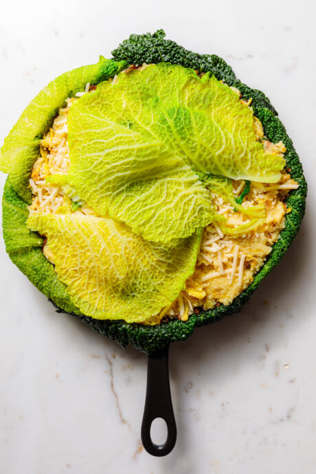 Jetzt werden die übrigen Wirsingblätter in der Mitte verteilt und dann wird der Pie mit dem überstehenden Blattgrün verschlossen. Gut andrücken!
