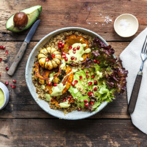 Good Life Kürbisbowl mit Linsenquinoa und Avocadodressing