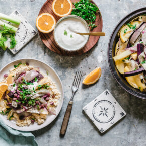 Mit Salz abschmecken und mit Sojajoghurt, Orangenscheiben und frisch gehackter Petersilie servieren.