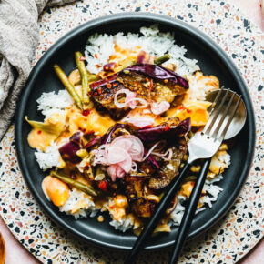 Auberginen auf dem Curry servieren und mit eingelegten Schalotten toppen. Dazu Jasminreis servieren.