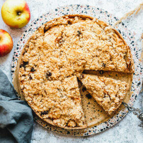Für die Streusel alle Zutaten mit einer Gabel oder den Händen vermengen und zu groben Streuseln verarbeiten. Kuchen gleichmäßig damit toppen.