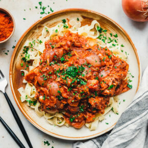 Zum Schluss mit dem restlichen Salz abschmecken und mit fein gehackter Petersilie toppen. Mit deiner liebsten Beilage servieren.