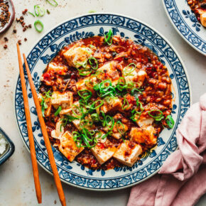 Das Einweichwasser der Pilze mit Wasser auf 500 ml auffüllen. In die Pfanne geben, aufkochen und bei niedriger bis mittlerer Hitze 5 Min köcheln lassen. Gebratenes Sojahack dazugeben, Tofu vorsichtig unterheben und 3 Minuten ziehen lassen. Speisestärke unterrühren, kurz aufkochen, bis die Sauce angedickt ist und mit dem fein gehackten Grün der Frühlingszwiebel und dem restlichen Szechuanpfeffer toppen.