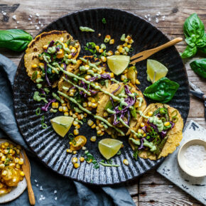 Tortillas mit Spargel und Maissalsa füllen und mit Avocadocrema, Rotkraut und fein gehackten Frühlingszwiebeln toppen.